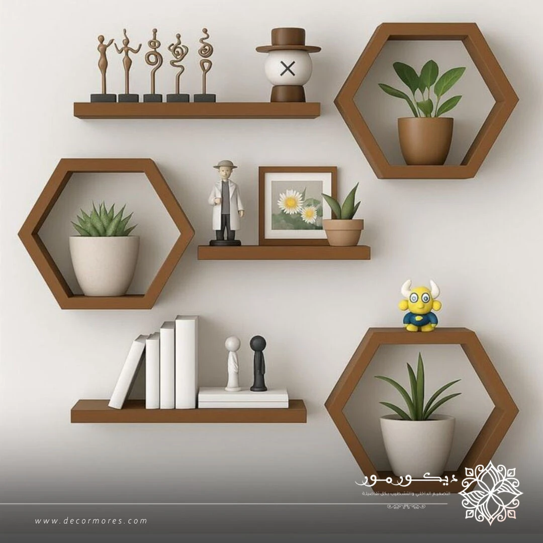 - الرفوف السداسية: تمنح الجدار طابعاً هندسياً حيوياً يشبه خلايا النحل.
