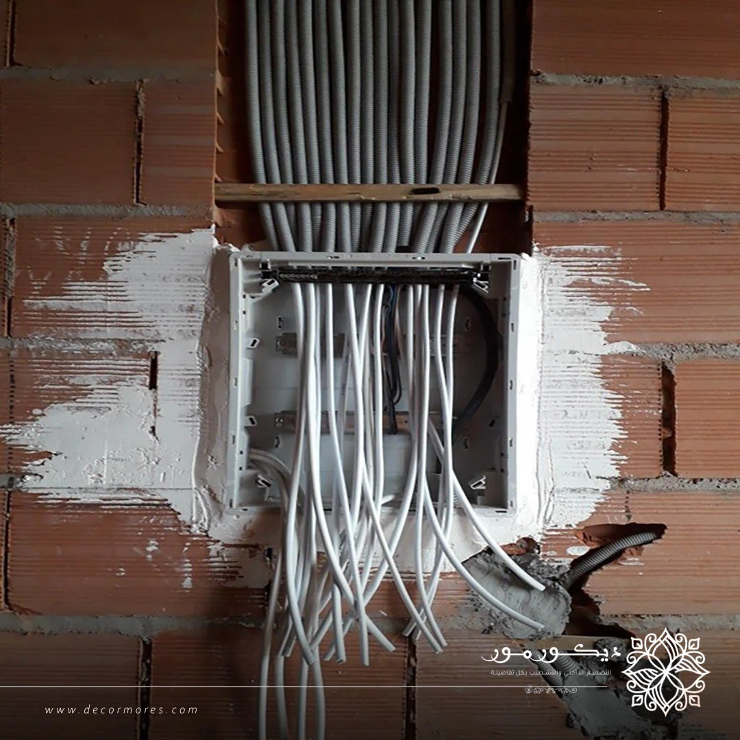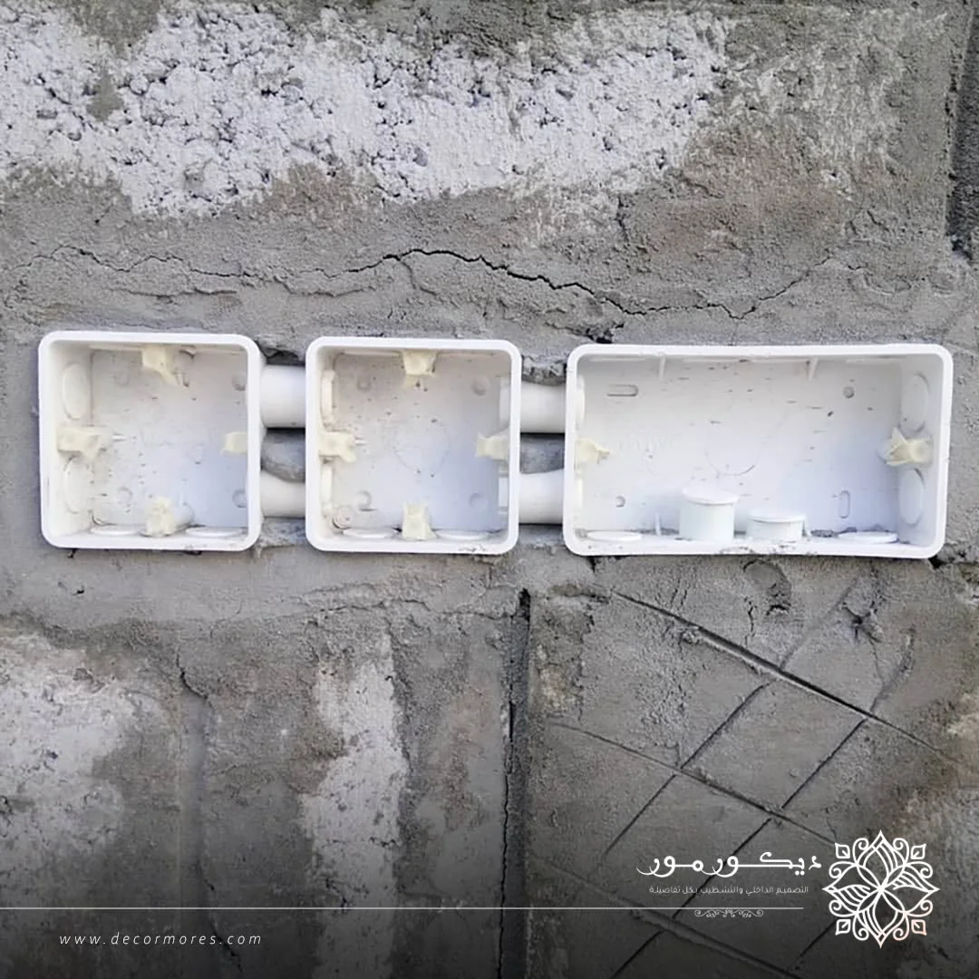 - أولاً، نحرص على تمرير الأسلاك بدقة داخل الجدران، مع تثبيت المفاتيح والمقابس بأماكن عملية وسهلة الوصول.